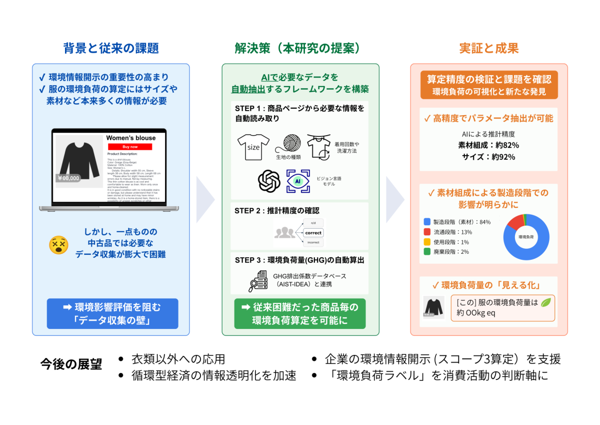 本研究は、フリマアプリに出品された古着一着ごとの環境負荷(GHG:温室効果ガス)をAIで自動推計する手法を確立したものです。